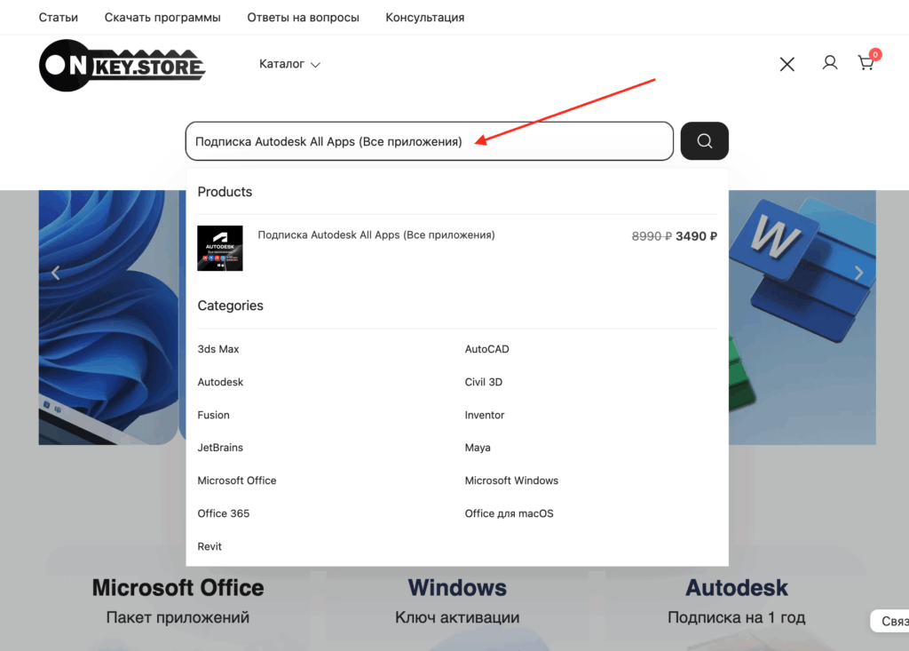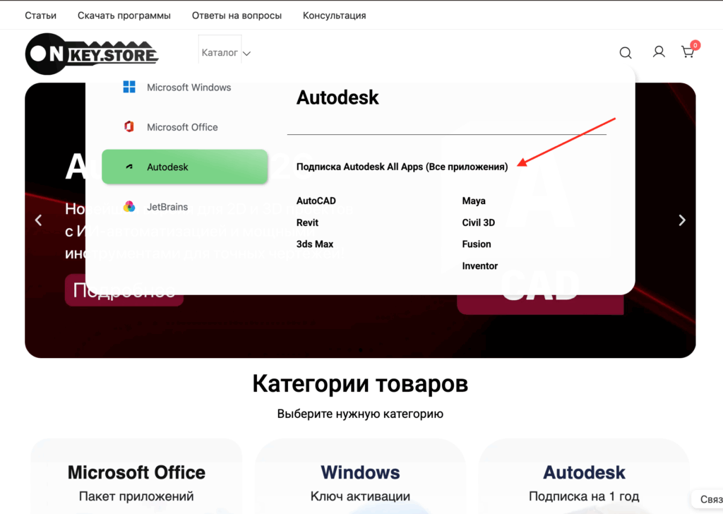 Теперь найдите продукт, который станет фундаментом вашей работы. В каталоге товаров или через поисковую строку сайта найдите «Autodesk» или конкретно «Autodesk (все приложения)».
